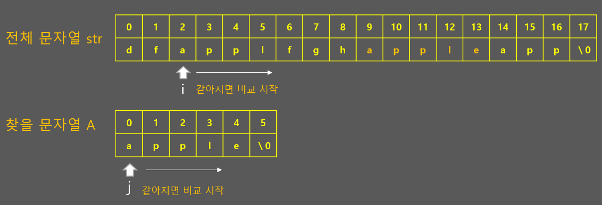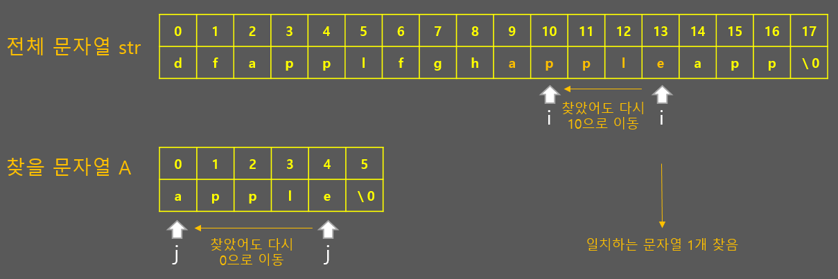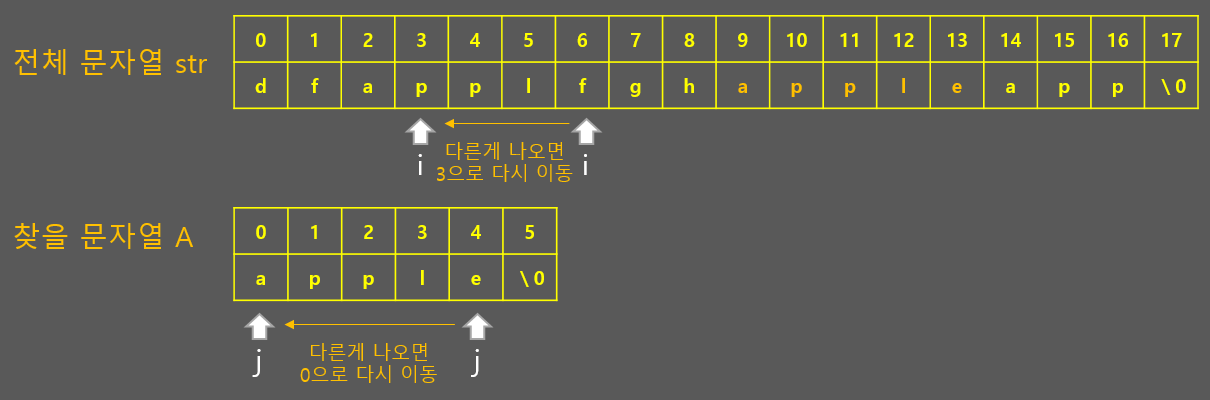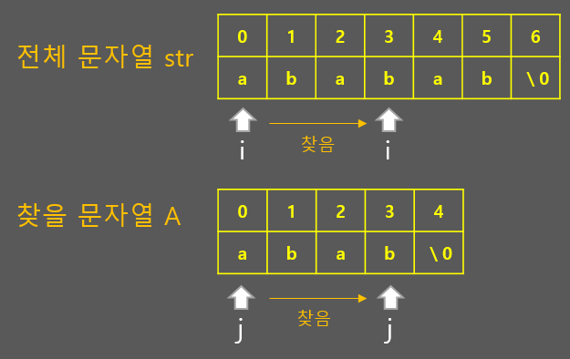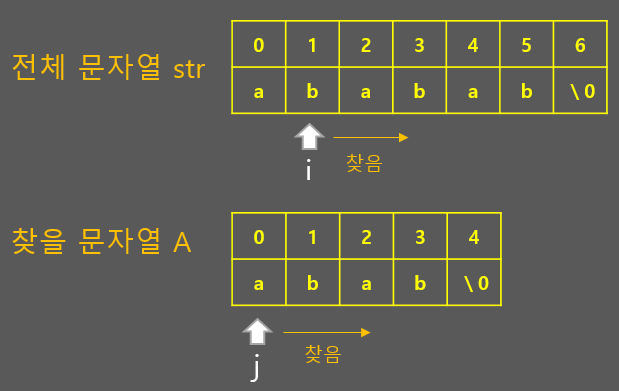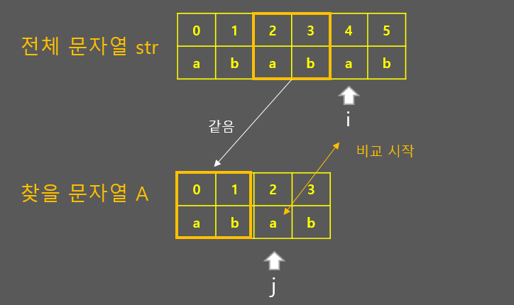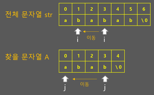 끝까지 같지 않고 다른 글자가 나오면 다시 앞으로 이동해서 반복합니다. 만약 여기서 i가 그 자리에서 계속 전진만 하면 아까 "ababab"에서 "abab"를 찾을 경우 처음 네 글자 하나밖에 찾을 수가 없게 됩니다. 따라서 i의 위치도 계속 앞으로 옮겨줘야 합니다.