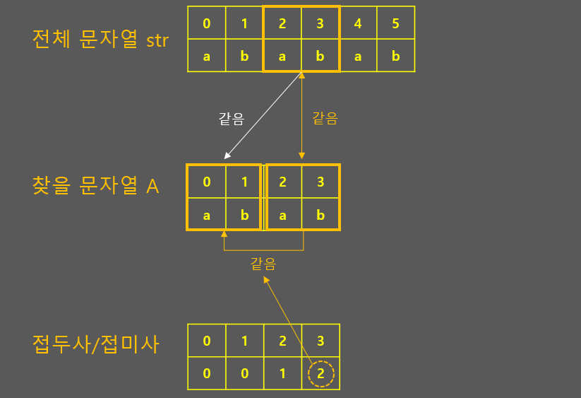 위와 같이, 뒤의 a 입장에서는 가장 앞과 똑같은 글자가 1개인 것이고, b입장에서는 앞의 a를 포함해 ab 두 글자가 같으니 똑같은 글자가 2개라는 뜻입니다. A[0~1] == A[2~3]이라는 뜻으로 보면 됩니다.