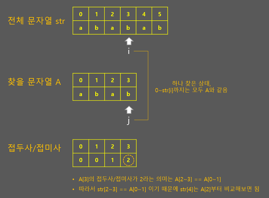 KMP 알고리즘에서는 접두사와 접미사라는 개념을 이용해여 일반 로직처럼 i가 전진하다가 다시 앞으로 돌아오는 일이 없도록 해 검색 효율성을 높여줍니다.