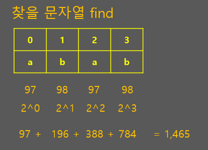 예를 들어 이번 라빈 카프 알고리즘에서 사용할 가장 간단한 해쉬값은 아래와 같이 만들 수 있습니다. "각 문자의 아스키코드"에 "2^자릿수" 를 곱해주고 그 합을 해쉬값으로 지정해주는 방식입니다. 현재 "abab"의 해쉬값은 1,465입니다. 중간에 문자가 하나 바뀌거나 같은 문자라도 자릿수가 다르면 모두 다른 값이 되는 것을 알 수 있습니다.