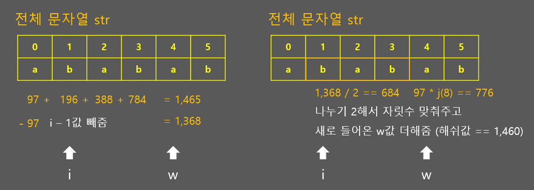 이런식으로 연산을 진행하며 해쉬값을 맞춰보고, str[w]가 문자열의 마지막에 갈때까지 반복수행 합니다. 해쉬값을 한 번 구해두면 찾을 문자열은 더이상 확인할 필요가 없게 되는 것이죠.