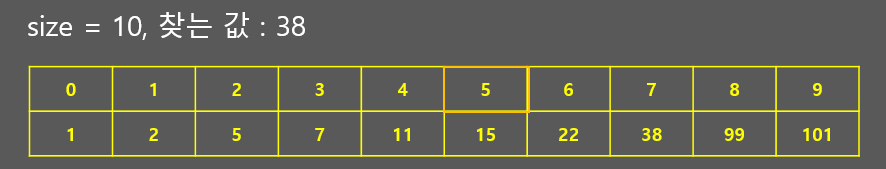 1. 절반으로 나눈 값(범위의 가장 중간에 있는 값)이 찾는 값과 일치할 때