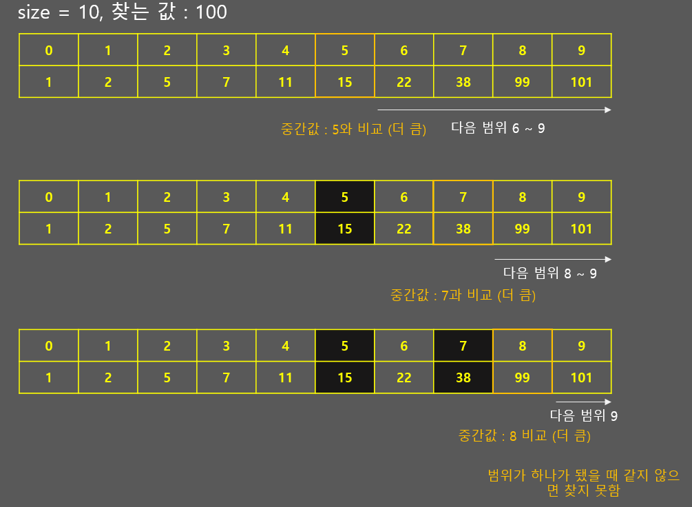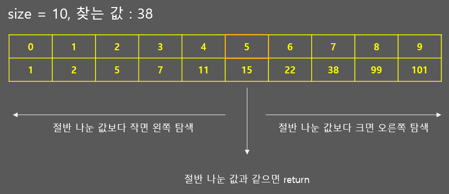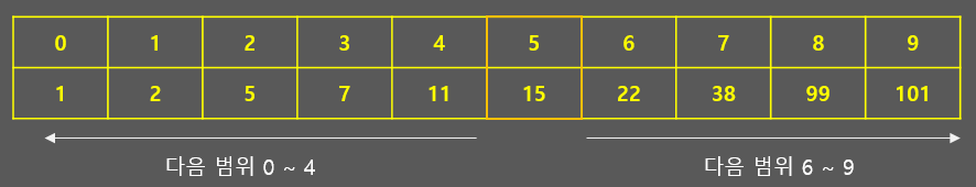 - 정렬된 데이터에서 특정 값을 찾을 때, 하나하나 찾는것이 아니라 범위를 좁혀나가며 찾는 방법