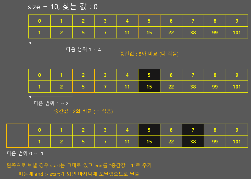 즉, 1번 탈출조건을 먼저 확인하고 아닐 경우 2번 탈출조건을 확인하면 됩니다. 범위를 이용하는 재귀함수에서는 대부분 비슷한 로직이 적용됩니다. 값을 찾았을 때, 또는 마지막에 도달헀을 때 두 가지를 재귀함수의 탈출 조건으로 주면 됩니다.