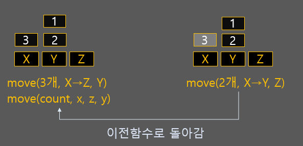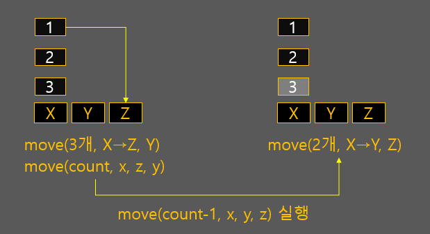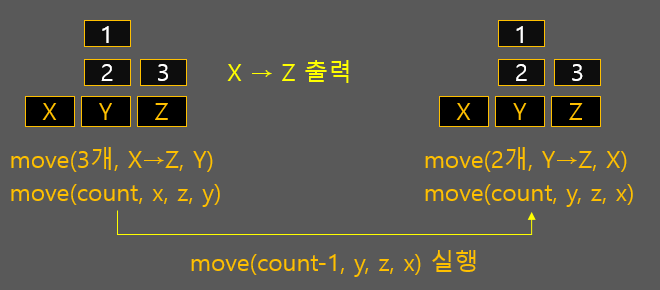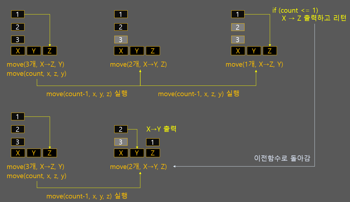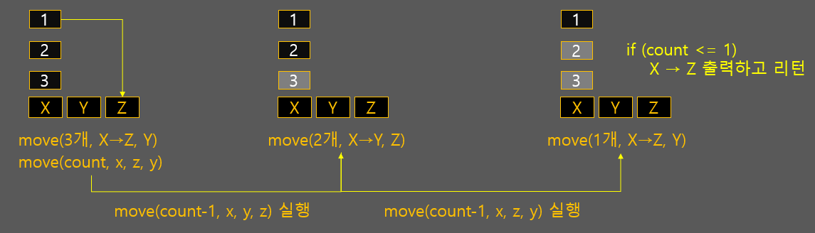 그리고 다시 마지막 순서를 수행합니다. 원판 갯수가 현재 2개짜리인 함수에 있으니까 원판 갯수를 하나 줄여주고(count - 1), 순서를 Z→Y로 바라보게 만들어 줍니다. 다시 count == 1인 함수가 실행됐고 탈출 구문에 걸려서 경로를 출력하고 리턴됩니다.