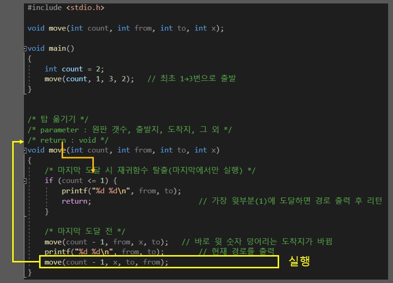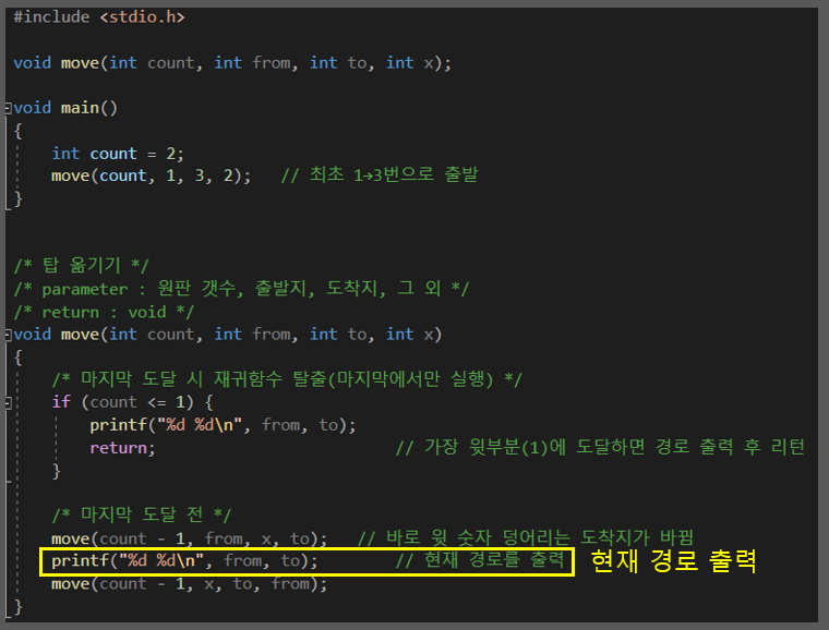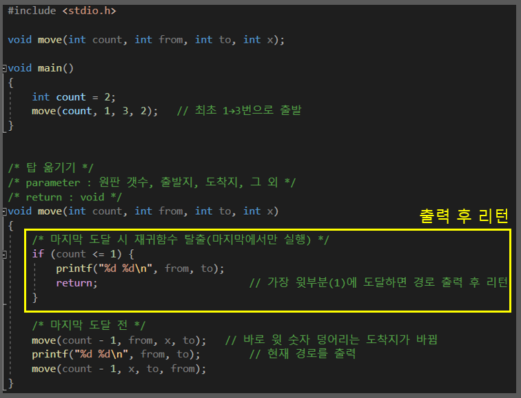 쭉쭉 타고 들어가다가 마지막에 도달하면, 1의 경로를 찍어주고 리턴시킵니다. 재귀함수 탈출 구문입니다. 1에서 출력하고 리턴시키는 이유는 2개의 덩어리가 한 쌍이기 때문입니다. 원판 갯수가 한 개만 들어올 때는 재귀함수 실행 이전에 탈출구문에서 경로를 찍어주고 탈출하기 때문에 2개 단위로 구성해도 문제가 없습니다. 해보시면 알겠지만 2개 단위일 때 세 번의 단계가 있기 때문에 한 개단위로는 경로를 올바르게 순서대로 찍을 수가 없습니다.