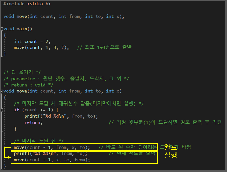 결국 최종적으로 원판이 2개만 있는 함수까지 재귀적으로 계속 들어갑니다.