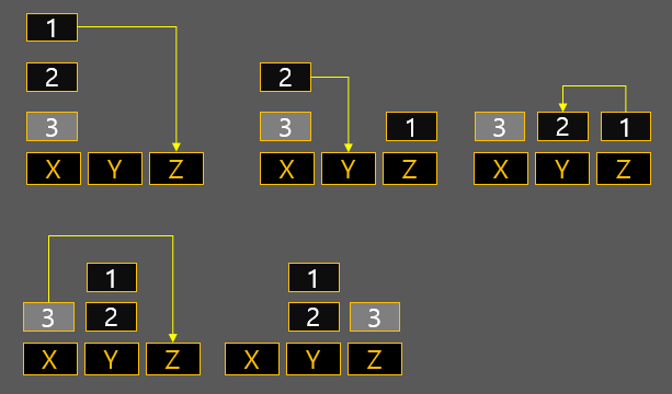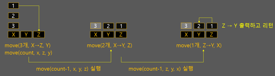 세 개짜리 원판에서 가장 아래쪽에 있는 3이 목적지인 Z로 가기 위해서는 그 위의 숫자들을 전부 Y로 보내야 합니다.
