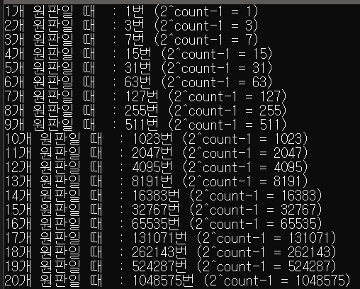 printf("%d개 원판일 때 : %d번 (2^count-1 = %d)\n",