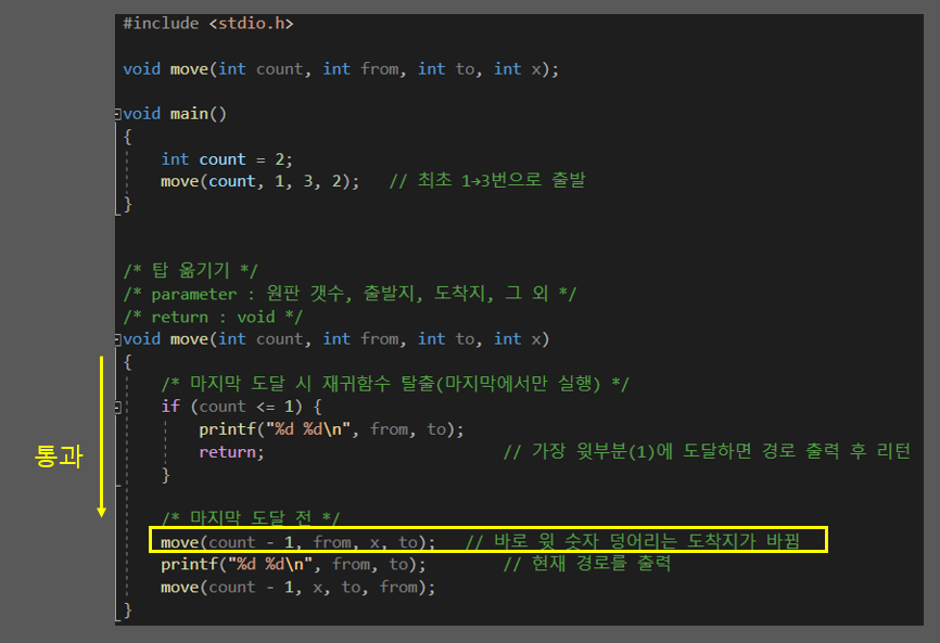 move2(count - 1, from, x, to); // 바로 윗 숫자 덩어리는 도착지가 바뀜