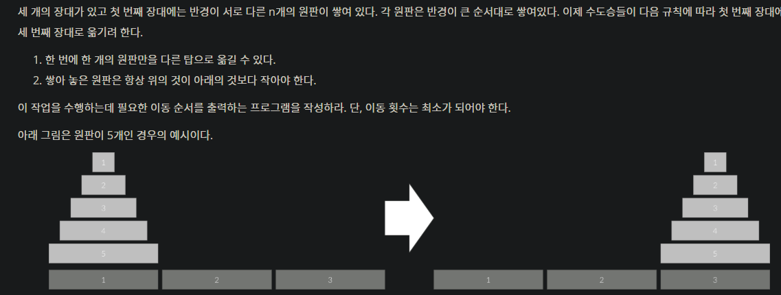 처음 풀어본 알고리즘 문제인데 이틀이 꼬박 걸렸습니다. 그런데 모범답안보니 너무 간단하네요. ㅠ 하노이탑 이동 원리를 아는 것 자체는 사실 무의미하지만 이 문제를 푸는 사고 과정 자체가 확립 되는 것이 중요할 것 같습니다. 머리 좋은 사람 참 많네요. 전 모범답안 보고도 한참 헤맸는데..