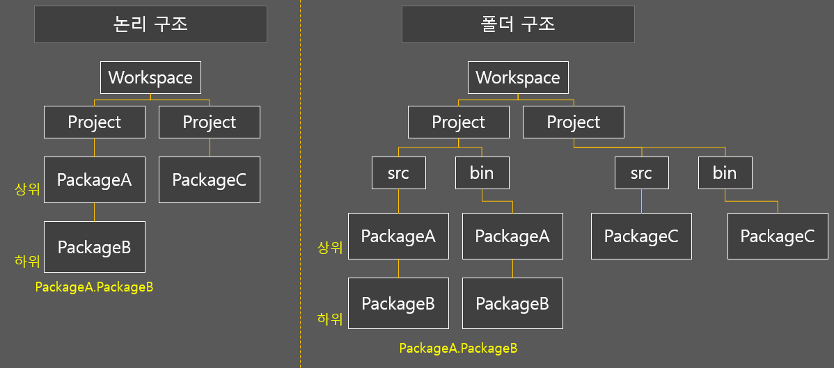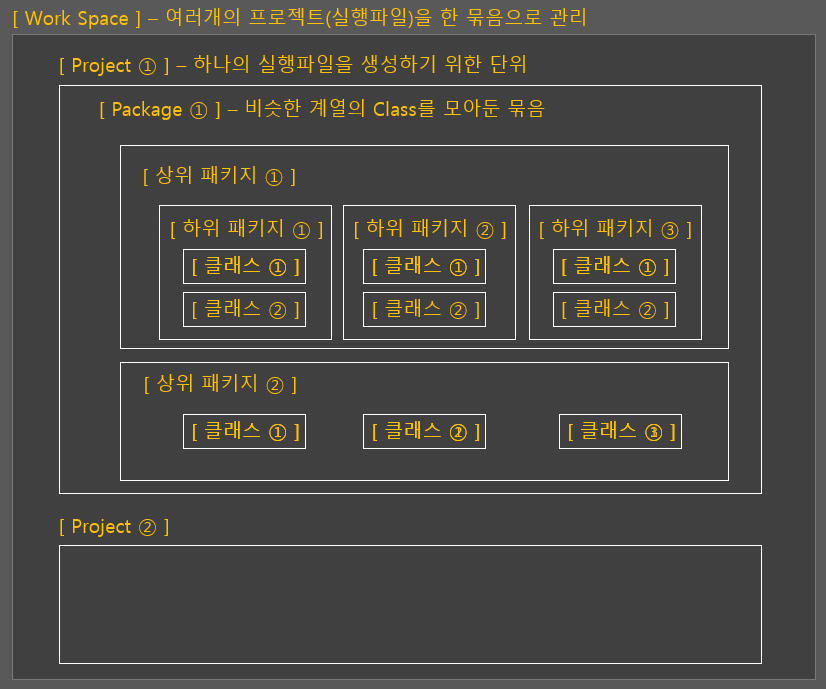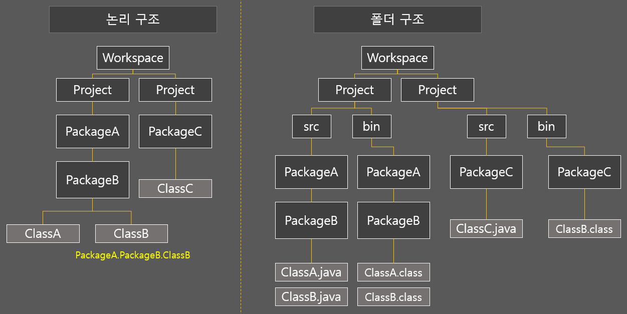 - .java파일을 컴파일해서 생성된 ".class"파일의 패키지는 프로젝트 폴더 아래 "bin"폴더에 저장됨