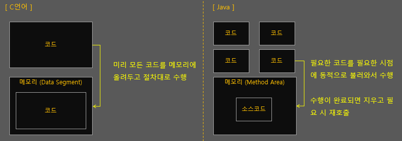 이러한 이유로 Java에서는 C언어와 다르게 모든 코드를 미리 메모리에 올려두지 않고 필요할 때마다 가져다 쓰는 동적 할당 방식을 사용합니다. 이 때문에 상대적으로 느릴 수밖에 없습니다. 물론 하드웨어와 소프트웨어 기술이 많이 발달해서 차이가 점점 줄어들고는 있지만 아직까지 속도차가 존재할 수밖에 없습니다.