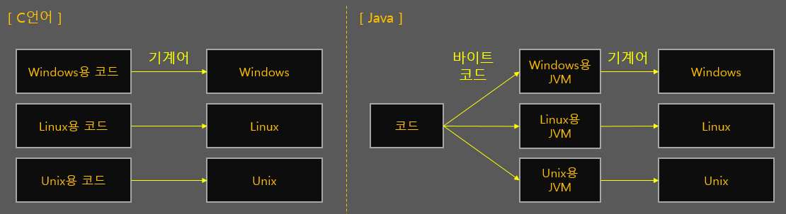 이렇게 하는 이유는 JVM이 OS나 기타 환경에 맞춰 약간씩 다르게 기계어로 번역한 뒤 실행해주기 때문입니다. 때문에 C언어는 OS 및 기타 환경에 따라 코드를 직접 따로 작성해줘야 하지만 Java는 같은 코드를 짜면 환경에 맞게 알아서 실행됩니다. 만약 새로운 버전의 Windows가 나와서 OS의 작동방식이 바뀌게 되면 C언어의 경우 코드를 이에 맞게 수정해줘야 하지만, Java는 코드 수정이 불필요합니다. JVM을 만드는 엔지니어들이 OS에 맞게 JVM을 다시 만들어주면 됩니다. 물론 C언어도 컴파일러가 각 환경에 맞게 컴파일해주는 방식으로 바뀐다면 신경쓸 필요가 없겠으나, 그렇게 해주고 있지 않습니다.