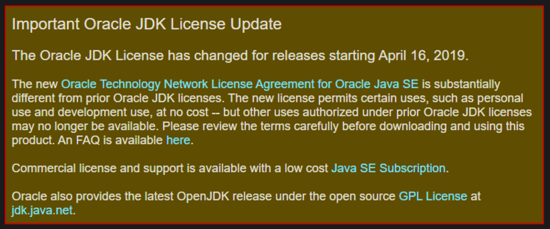 그래서 일단 JDK 이전 버전(11.0.5)을 깔기로 했습니다. 오라클 홈페이지에서 12버전은 못받는데 11.0.5버전은 받을 수가 있습니다. 하다보면 라이선스가 유료로 바뀐 것 같은 뉘앙스의 메세지가 뜨지만 오라클에서 제공하는 원래부터 유료였던 제품을 이용하지 않는다면 전혀 관계가 없는 내용입니다. 앞으로도 개인으로서는 거의 접할일이 없는 제품들인만큼 신경쓰지 않아도 됩니다.