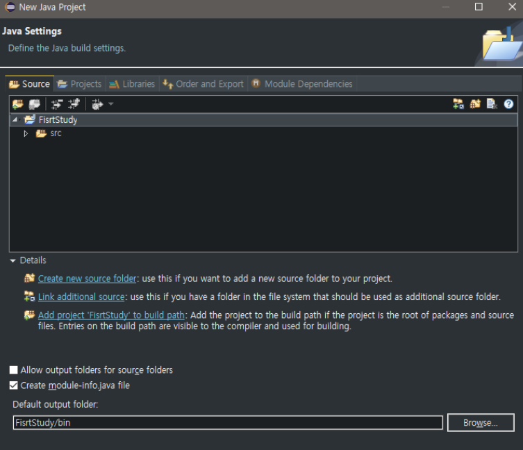 일단 다시 프로젝트를 생성할 때 아래 "Create module-info.java file" 이라는 부분에 체크를 해제하고 똑같이 패키지와 클레스를 생성해 보았습니다.