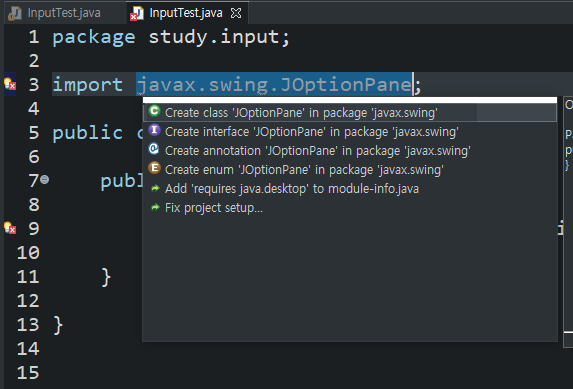 입력값을 받기 위한 JOptionPane 클래스를 사용하기 위해 아래와 같은 코드를 짰습니다.