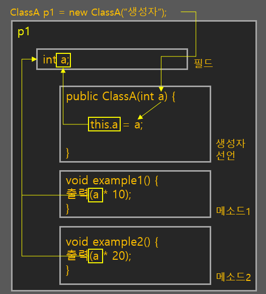 - 클래스의 필드값과 메소드의 변수값이 동일할 때 둘을 구분하기 위한 장치