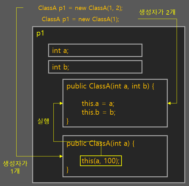 생성자의 경우 메소드와 마찬가지로 오버로딩이 가능합니다. 즉, 인스턴스 생성 시 제공되는 생성자의 타입에 따라 다르게 값이 들어가도록 설정 가능합니다. 이 때 코드의 효율적 사용을 위해 this를 사용해 다른 메소드를 호출할 수 있습니다.