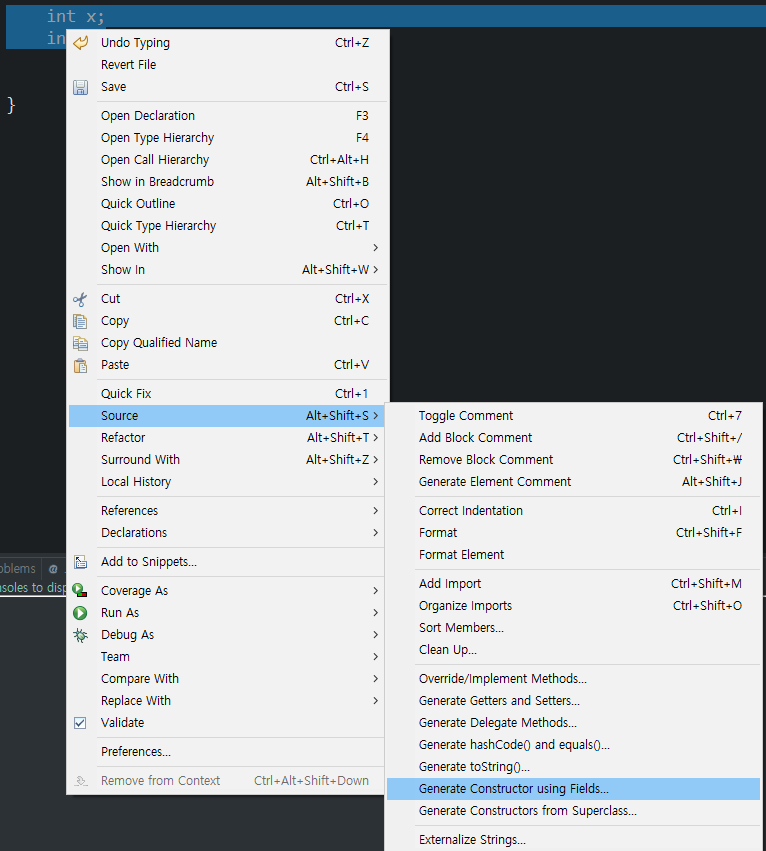 한가지 팁은 생성자 선언은 굳이 직접 코드로 짤 필요가 없고 이클립스의 기능을 이용하면 자동으로 만들어 줍니다. 우클릭 - Source - Generate Constructor using Fields"를 클릭한 후, 생성자로 사용하고 싶은 필드를 선택해서 "Generate" 해주시면 자동 생성됩니다.