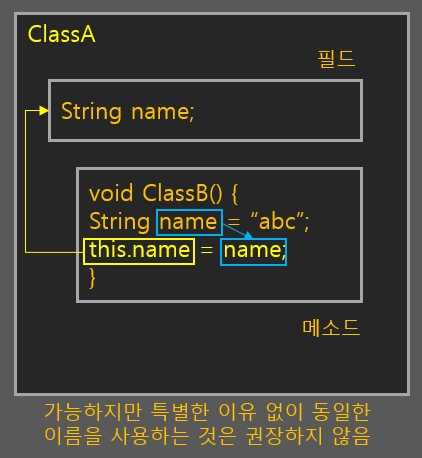 이유 없이 메소드의 변수와 클래스의 필드 이름이 같은 것은 권장하지 않지만, 일단 아래와 같은 방식으로 사용하는 것도 가능합니다.