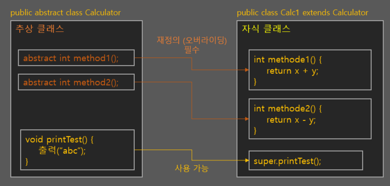 추상 클래스란 곧 아직 완성되지 않은 클래스라는 의미입니다. 완성되지 않은 클래스 안에는 완성되지 않은 메소드가 있기 때문에 이를 재정의해서 사용하면 되는 것이죠. 그 외에는 일반 상속과 같습니다.