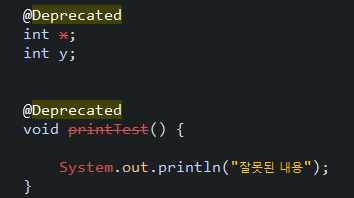 - 해당 변수나 메소드 사용을 권장하지 않는다는 표시를 해줌